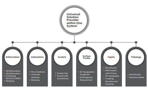 UST® – Universal Surface Tester, est le seul système ouvert multi-modulaire qui fournit une solution complète d’essais mécaniques pour l’évaluation des matériaux en vrac et des revêtements de surface. Plus de 10 mesures peuvent être effectuées et plus de 60 pointes de test différentes ont été développées pour répondre à la diversité de vos besoins de caractérisation.