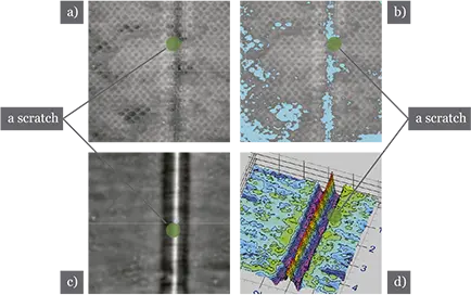 a) Direct comparative analysis on a surface after a scratch test with the same resolution of: Visual Impression, light intensity