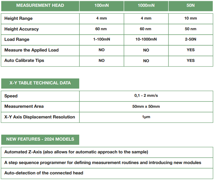 The basic unit of UST® has three versions: UST® 100 (loading range 1mN-100mN), UST® 1000 (loading range 10mN-1000mN) and UST® 50 (loading range 2-50N). The basic unit consists of floor-stand cabinet, measurement head with 3 tips, automatic X-Y table and data acquisition system.