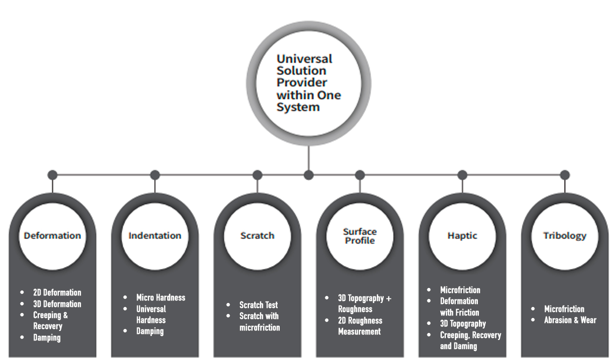 UST® – Universal Surface Tester, is the only open multi-modular system that provides a complete mechanical testing solution for the evaluation of bulk materials and surface coatings. Over 10 measurements can be accomplished and over 60 different test tips have been developed to meet the diversity of your characterization requirements.